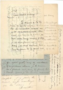 VERHAEREN, Emile3 lettres aut.s. à un "cher petit vieux" non ident., s.d. + 1 l.a.s. de Marthe Verhaeren avec post-scriptum aut.s. d'E. Verhaeren au même, c. 1909-1910,