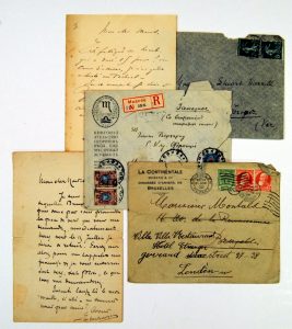 1 p. sur 1 double f., in-12. Plis lég. usagés.  Sur le point de quitter Bruxelles, il ne peut lui envoyer immédiatement la pièce de vers qu'il lui demande. Il termine : "(...) laissez là le mot "maître" si usé - ne sommes nous pas amis ?".  Joint : Id. - Envel. aut. à Stuart Merrill, timbres français et cachets postaux illisibles. - [Non déchiffré] - Envel. ms. en russe et en français à Emile Verhaeren, Moscou, 1911 ?, timbres et cachets postaux russes. - Rodenbach, Georges - Lettre aut.s. à Octave Maus, s.l., s.d., 1 p. sur 1 double f., in-12. Très fatigué, il n'a pu assister au festival et se trouve en ce moment à Blankenberghe, en compagnie de Verhaeren. - [Non ident.] - Envel. ms. à Constant Montald, Bruxelles, juin 1908. (5 pcs)