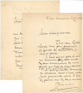 1 1/2 pp. sur 1 double f. , in-12. "J'ai déjà fumé un des ces bons cigares que vous avez eu la gracieuseté de m'envoyer à votre bonne santé (...) Présentez je vous prie mes hommages et mes amitiés à Madame Trutschel (...)". Il s'agit sans doute du baron et de la baronne Trutschel, mécènes polonais de l'artiste Boleslaw Biegas qui réalisa en 1906 un buste de Verhaeren (conservé dans un musée de Cracovie). Joint, du même - Lettre aut.s., corresp. non ident., Saint-Cloud, s.d., 1 p. sur 1 double f., in-12. "Theo van Rysselberghe vous fera parvenir la photo du dessin déjà ancien dont je vous ai parlé". Il lui envoie également pour son étude une caricature et une photo récente. (2 pcs)