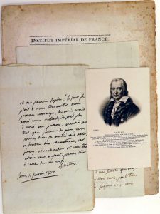 A Ginguené "directeur-général de l'instruction publique", Paris, 15 prairial an 5, 2 pp. sur 1 double f., in-8, adresse et marques postales. Pierre-Louis Ginguené (1748-1816) était un journaliste, écrivain, professeur et poète français; il fut directeur de l'Instruction publique sous le Directoire. Grétry se réjouit de ce que 50 ex. de son ouvrage sur la musique aient été donnés aux artistes de l'opéra. Il ne pense pas que ce don gratuit puisse nuire au débit de l'ouvr. dont 1200 "volumes" ont été vendus en 3 mois. A Sophie Bour, Paris, 11/2/1810, 1 p. sur 1 double f., in-12, adresse et marques postales. Encouragement contre un mauvais sort. "Quant à moi tant que j'aurai du pain, vous pouvez dire la moitié est à moi (...) Adieu cher enfant. prennez l'air à cause de vos nerfs".  Joint : Funérailles de M. Grétry. Le 27 septembre 1813. Institut impérial de France. Paris, Firmin Didot, [1813], 1 double f., in-4. Discours prononcé par Etienne-Nicolas Méhul au Père-Lachaise. - Carte postale ancienne au portrait de Grétry. - Photocopie ancienne d'une lettre de Grétry à Salgues. - 3 lettres de libraires parisiens à Georges de Froidcourt, érudit et collectionneur de documents relatifs à Grétry.