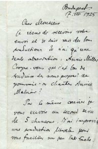 3 pp., sur 1 double f., in-12. Lég. défr.  Probablement à son traducteur anglais : il est ravi des traductions qu'il vient de recevoir, sauf en ce qui concerne la transposition de "Annie Molnár" en "Annie Miller". Il lui envoie une seconde série de 5 chansons que son éditeur Foss (Oxford University Press) a commencé à graver et évoque les honoraires du traducteur.