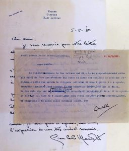 1 p. sur 1 f., in-4. Papier lég. jauni.  Du compositeur italien G.C. Menotti (1911-2007) à l'organiste et critique musical B. Gavoty (1908-1981). Il évoque son séjour à Spoleto, le tournage d'un film de télévision qui s'est bien passé et espère venir à Paris pour l'exécution d'"Anthony and Cleopatra" de Samuel Barber au Théâtre des Champs-Elysées.  Joint : Casella, Alfredo - Sign. aut. sur 1 lettre dactyl. en italien, à "Nordio", Passo Pordoi, 26/6/1922. Le chef d'orchestre et pianiste italien (1883-1947) accepte son invitation. (2 pcs)