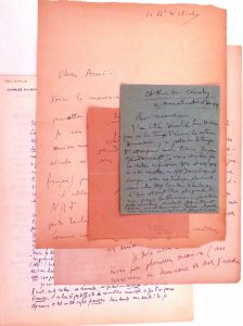 A propos de sa mise en musique de poèmes de Coventry Patmore dans la traduction de Paul Claudel. Il lui envoie le manuscrit pour lui permettre d'établir un devis. L'ouvr., texte et musique, fut publié par Stols en 1931 avec des bois de J. Buckland-Wright. Joint : Sauguet, Henri - Lettre aut.s., corresp. non identifié, Contras (Gironde), 26/8/1946, 2 pp. sur 1 f., in-4. Remerciements pour son appréciation flatteuse de la musique de scène d'"Ondine" (pour une pièce de Giraudoux). Il espère assister à une de ses représentations d'"Ondine" à Bruxelles, où sera également exécuté un fragment de son opéra "La chartreuse de Parme". Une représentation d'"Ondine" fut donnée par le Théâtre national de Belgique en janvier 1947, mise en scène Jacques Huisman. - Id. - Lettre aut.s. à Georges Cherière, directeur de "Diapason", Paris, 26/10/1975, 1 p. sur 1 f., in-4, envel. cons. Il lui demande d'insérer dans sa revue un communiqué concernant Charles Koechlin, "ce grand musicien français". - Enesco, Georges - Mot aut.s. à Feridah Thomas, [Paris], carte-lettre, cachet postal illisible. Rendez-vous. - Id. - Lettre aut.s. à Bender, [Paris], 16/1/1929, carte-lettre. Il donne des précisions sur une oeuvre composée en 1915. - Oulmont, Charles - 2 lettres aut.s. dont 1 à P. Moulaert + 1 fac-similé. (8 pcs)