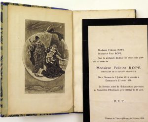 in-12 (qqs min. rouss., petit accroc au frontisp.), bradel demi-toile bleue, dos lisse titré or. Non coupé. Edition originale. Un des qqs ex. sur japon feutré, avec le frontisp. sur vergé avant le nom de l'éditeur. Ref. Rouir 561 et III, p. 691. Vicaire V-673. Joint : Du Laurens, Henri-Joseph - Histoire de la Sainte Chandelle d'Arras. Réimpression textuelle (...). [Frontisp. par F. Rops]. Bruxelles, Kistemaeckers, [1880], in-12 (min. piq. sur le frontisp.), bradel papier décoré (dos part. détaché), couv. et dos cons. 1/250 (sur 300) non n. sur papier teinté, avec le frontisp. sur vélin. Ref. Rouir 549 et III, p. 691. - Faire-part de décès de F. Rops (9/7/1833-23/8/1898), annoncé par sa femme et son fils (défr., plis). - Rops, Félicien - 5 héliogr. ou reprod. - [Macé, René] - L'abbé en belle humeur. Bruxelles, Gay & Doucé, 1881, in-12, bradel papier marbré, étiq. de cuir sur le dos lisse, couv. cons. Frontisp. en bistre sur chine par [Chauvet]. Ex. non justifié sur vergé. Jolie édition, texte cerné d'un filet ovale bleu. (3 vol. et 6 pcs)