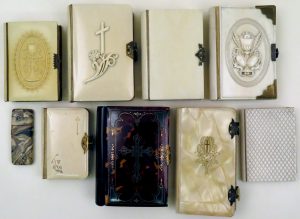 Containing 11 prayer books in Dutch, German, French and Spanish, some in ivory or ivorylike binding; 5 portfolios, some also in ivorylike materials, with embroidery on covers or finished with parchment; a leporello book in Chinese (?), a booklet with all text barred, a small ivory box with manicure (?) set and some other curious books.