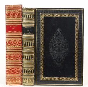 in-8 (lég. rouss.), veau glacé bleu nuit (petits frottements aux coins et coupes), plats cernés de roulettes à froid et de filets et petits fers dorés, large cartouche losangé central à froid, dos à 4 doubles nerfs plats fil. dorés (mors lég. frottés), entrenerfs entièrement fleuronnés dorés, filets et palettes dorés en queue, bordures ornées dorées, tr. dorées. Portrait-frontisp. sur chine appliqué. - Montesquieu, Charles de Secondat de - Oeuvres complètes (...) précédées de son éloge par d'Alembert. Ibid., 1827, gr. in-8 (lég. rouss.), demi-cuir à grain long cerise à coins (coins très lég. émoussés), dos à 4 doubles nerfs plats fil. dorés, entrenerfs entièrement fleuronnés dorés, palettes et grecques dorées en tête et queue, non rogné, étui cartonné. Portrait-frontisp. sur chine appliqué.