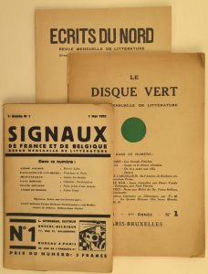 n. 1, 4, 5, 8 & 9, soit 5 fasc. - Le Disque vert. Réd. A. Salmon, J. Paulhan, Fr. Hellens, Mélot du Dy, O.-J. Périer, P. Fierens, R. Goffin. Bruxelles, L'Expansion belge, 1ère [- 2e année], 1922-1923, n. 1-6 [- 1, 3, 4/5/6], soit 9 fasc. Tête de collection. Complet du rarissime n. 1 !. - Ecrits du Nord. Dir. Fr. Hellens et P. Vanderborght. Ibid., 1ère année, 2e série, n. 1-3, soit 3 fasc. Série complète. Outre ceux des cofondateurs, les revues contiennent des textes de P. Morand, A. Malraux, I. Ehrenbourg, N. Doff, A. Derain, L. Chenoy, P. Mac Orlan, P. Pia, Bl. Cendrars, M. Jacob, H. Michaux, R. Purnal, M. Arland, H. Pourrrat, P. Bourgeois, C. Goemans, R. Crevel, Fr. Ponge, M. Gorki, L. Pirandello, etc.; en outre, une enquête sur "Le symbolisme a-t-il dit son dernier mot ?". Joints, 7 fasc. en double ou triple ex. : "Disque", 1922, n. 4, - 1923, n. 1 et 4/5/6 (2 ex.). - "Ecrits", n. 1 (2 ex.) & 3. (24 fasc.)