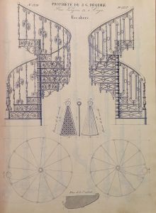 in-4, en ff., sous chemise en demi-percal. verte (abîmée, plats fort brunis), titre et 24 pl. gr. sur acier (qqs rouss. & bruniss.). Mobilier néo-gothique. - Sanguineti, Antoni - Le Moniteur des menuisiers. Album de menuiserie moderne. Nouveaux travaux exécutés dans les quartiers neufs de Paris (...). Dourdan, Thézard [étiq. collée], s.d. [années 1870 ?], in-4, en ff., sous chemise en percal. rouge titrée "Menuiserie moderne", titre impr. et 50 pl. lithogr. en noir. Portes, mobiliers de magasins, édicules, kiosques, devantures de boutiques... - Gateuil, N. - [Recueil de menuiserie pratique (...)]. Dourdan, Thézard, s.d. [c. 1881 ?], gr. in-4, demi-percal. brune, couv. d'une livr. collée sur les plats, 96 pl. clichées en brun. Meubles, lucarnes, stalles, chaires, escaliers, etc. - Fonderie d'ornements en fonte et cuivre de J.-G. Requilé (...). Liège. Liège, Impr. Thiriart-Delfosse, s.d. [années 1860 ?], in-4, demi-percal. brune à coins (émoussés), dos lisse (frotté avec petits manques), 168 pl. lithogr. (1 volante). Intéressant cat. publié par la fonderie liégeoise pour lutter contre la contrefaçon de sa production. Banquettes, balcons, escaliers, candélabres, colonnes, lustres, bancs de communion, etc. - Fonderie de fer et de cuivre, ornements en tous genre par N. Porta & Cie, à Huy. Album complet. S.l., s.n., s.d., in-4, demi-toile brune (dos usagé), titre et 269 pp. de motifs lithogr. + table et qqs ff. volants. Bacs à charbon, gaufriers, grilles en fonte pour cuisinières, poêles, bouches de chaleur, etc.