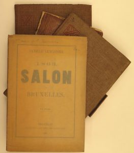in-12 (qqs rouss.), toile brune d'édit. (sans le crayon). Impression en rouge et noir sur papier gris. Titre mal centré. Ex-libris Renier Chalon. - [Mêmes titre, édit., date et présent.] (fortes rouss., garde sup. détachée, sans le crayon). Ex. du 2e mille, avec le titre correctement centré. - Catalogue de la VIe exposition des XX avec un préambule par Octave Maus. Ibid., 1889, in-12, papier ligné d'édit. (abîmé). Impression en bleu et rouge sur vergé. Importante préface. Joint : Lemonnier, Camille - 1863. Salon de Bruxelles. Bruxelles, Typ. Vanderauwera, 1863, in-12, br. Edit. orig. du 1er ouvr. de Lemonnier (4 vol.)