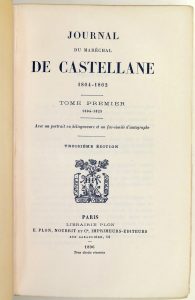 Journal du maréchal de Castellane, 1804-1862. Paris, Plon, Nourrit et Cie, 1896-1897 5 vol., in-8, demi-chagrin brun foncé, dos à 5 nerfs fil. dorés (très lég. passés), t. dorées. Bon ex.  Mention de 2e édit. dans les t. III & IV, de 3e édit. dans les autres. Journal publié par sa fille, la comtesse de Beaulaincourt née Castellane, et P. Le Brethon. Ill. (complet) de 5 portraits héliogr. et d'un fac-similé. Pair et maréchal de France, titulaire de nombreuses distinctions honorifiques, le comte de Castellane (1788-1862) fut un acteur important du 1er Empire (il participa dès 1804 à de nombr. campagnes napoléoniennes et e.a. à la campagne de Russie). Par la suite, il participa au siège d'Anvers en 1832 ainsi qu'à la répression qui suivit le coup d'état de 1852. Ref. Tulard 1971, 136. Joint : Du Barail, François-Charles - Mes souvenirs. 1820-1851 [- 1864-1879]. Ibid., 1894-1898, 3 vol., in-8, br. (couv. poussiéreuses). Div. mentions d'édit. Ill. de 3 portraits-frontisp. (8 vol.)