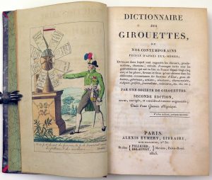pet. in-8, demi-basane rouge XIXe s. (coins lég. frottés), dos lisse orné doré (passé, frotté, mors frottés, etc.), tr. jaspées, 491 pp. (lég. mouill. aux 1ers ff., rouss. passim). Ex. usagé. 2e édit. parue la même année que l'orig. Complet de la caricature-frontisp. rehaussée, légendée "Si la peste donnait des pensions, la peste trouverait encore des flatteurs et des serviteurs". Célèbre dictionnaire rédigé en collaboration avec P.-J. Charrin, C. de Proisy d'Eppe, R. Perrin et J. Tastu, stigmatisant les opportunistes de la période 1789-1815; chaque nom est accompagné d'un certain nombre de girouettes sous forme de petits drapeaux (jusqu'à 12 pour Fouché !).