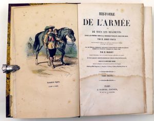 4 (sur 5) vol., in-8, demi-percaline brune à coins postérieure, dos lisses (mors frottés), [4]-479-[1], [4]-494-[1], [4]-464-xxxv-[1], [4]-460-cxxxiv-[2] pp. (rouss., piq. et mouill. passim, qqs grossières restaurations anciennes, qqs ff. plus courts, etc.). Vendu sans retour possible. S.w.a.f. Edit. originale (?, sans le 5e vol. paru en 1858) de cet ouvr. qui illustre l'évolution de l'art de la guerre en France et en Europe, par l'historien militaire A. Pascal (1815-1863); le t. IV est une continuation par J. Lecomte sous le pseud. J. Du Camp. Par rapport à la table des pl., complet du frontisp. sur chine appliqué dans le t. I (souillé, rogné) et des 125 planches hors texte : 104 rehaussées et part. gommées (la plupart par Philippoteaux, toutes sur bois; qqs-unes brunies) figurant des uniformes et 21 en noir (sur bois ou sur acier) figurant divers épisodes guerriers. Nombr. tableaux et index. Selon Colas qui ne répertorie que des édit. en 5 t., l'ouvr. se trouve rarement homogène quant aux dates et aux éditeurs.
