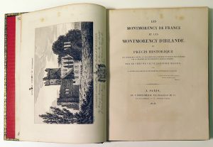 in-4, cuir gaufré à grain long bleu foncé signé Ducastin, plats cernés de multiples cadres de roulettes à froid et de filets et fleurons dorés, large cartouche à froid au centre des plats, dos lisse orné en long de filets dorés et de fleurons à froid, palettes dorées en tête et queue, bordures ornées dorées, coiffes et coupes guillochées dorées, tr. dorées, [4]-214-[1] pp. (piq. et rouss. intermittentes). Bel ex., bien conservé.  Très rare édition orig., probablement tirée à petit nombre, de cette revendication irlandaise, contenant une généalogie complète des Montmorency d'Irlande. Ex. sur papier vélin, ill. de 20 pl. hors texte gravées sur cuivre (19) ou lithogr. (1) dont 1 frontisp., représentant des châteaux, des tombes, etc.; armoiries gravées sur cuivre in texto, un tableau généal. dépl. Qqs annotations anciennes à la plume dans l'ouvr. Belle reliure de style romantique par P.-A. Ducastin ou Ducastin fils, actifs à Paris dans la 1ère moitié du XIXe s. Cachet couronné au verso du titre.