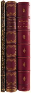 Catalogue des livres composant la bibliothèque de feu M. le Vte du Bus de Gisignies, 1876, vi-256 pp., cont. red half morocco, t.e.g., large paper copy. Sold 28 III - 1 IV, 1984 lots. - Catalogue de la bibliothèque de feu M. Louis Veydt, ancien Ministre des Finances, 1879, viij-424 pp., cont. red half morocco, t.e.g., presentation inscription by Olivier to Veydt stating that this is 1 of 2 large paper copies. Sold 10-19 II, 3492 lots. - Catalogue des livres rares et précieux de la bibliothèque de M. le Comte de S[auvage], 1880, 97-[1] pp. + prix d’adjudication (8 pp.), cont. marbl. boards. Sold 15-17 IV, 345 lots.