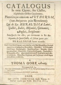 Bibliography - heraldry - GORE, Thomas - Catalogus in certa capita, seu classes, alphabetico ordine concinnatus, plerorumque omnium authorum, (tam antiquorum quam recentiorum) qui de re heraldica Latine, Gallice, Italice, Hispanice, Germanice,...