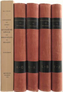 5 vol., gr. in-8, 4 vol. toile rouge (lég. frottés), étiq. de titre noires + 1 vol., supplément, br. Bon ex. Important catalogue des incunables localisés en Belgique. Avec le supplément paru en 1978. Cachets.