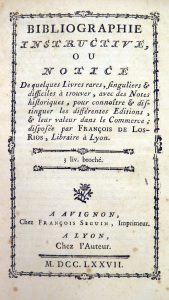 Bibliography - rare books - LOS RIOS, Jean-François de - Bibliographie instructive, ou Notice de quelques livres rares, singuliers & difficiles à trouver (...). Avignon, Fr. Seguin; Lyon, chez l'auteur, 1777