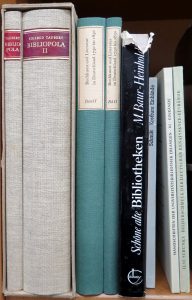 Hamburg, Hauswedell & Co, 1966 2 vol., 4to, cloth, flat spines, gilt red leather title labels. Nice set. History and iconography of the book trade. With many illustrations. Ref. Bn-Opale plus.We join : Kyriss, E. - Die Einbände der Handschriften der Universitätsbibliothek Erlangen. Erlangen, Universitätsbibliothek, 1936, 8vo, sewn, unopened. - Schunke, I. - Studien zum Bilderschmuck der Deutschen Renaissance-einbände. Wiesbaden, O. Harrassowitz, 1959, 8vo, sewn. Vol. 8 of "Beiträge zum Buch-und Bibliothekswesen". - Baur-Heinhold, M. - Schöne alte Bibliotheken. Ein Buch vom Zauber ihrer Räume. München, G.D.W. Callwey, 1972, 4to, ill. publ. cloth, ill. dw. - Schmitt, F.A. - Kostbare Einbände. Seltene Drucke. Karlsruhe, Badenia Verlag, 1974, 8vo, publ. binding. - Hauswedell, E.L., Voigt, Chr. (herausgegeben von) - Buchkunst und Literatur in Deutschland, 1750 bis 1850. Hamburg, Maximilian-Gesellschaft, 1977, 2 vol., 4to, publ. cloth, ills. (8 vol.)