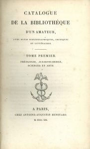 Library catalogue - RENOUARD, Antoine Augustin - Catalogue de la bibliothèque d’un amateur, avec notes bibliographiques, critiques et littéraires. Tome premier (- quatrième). Paris, (Crapelet for) A.-A. Renouard, 1819