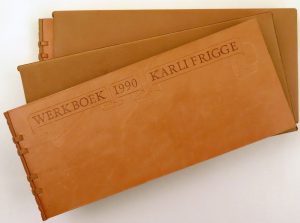 Joppe, Karli Frigge, 1990-1991 2 vol., oblong 8vo, hand-bound harnass-leather bindings with blindstamped titles on covers, blindstamped leather slipcases. Very nice copies. Marbles from the years 1990 till 1991 containing samples of microcosms, galaxies and other miraculous inventions, in black and white and in colour. Together with explanatory notes, original drawings and handwritten text by Frigge. Only 4 copies of each notebook.