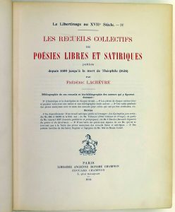 Rare books - France - LACHEVRE, Frédéric - Le libertinage au XVIIe siècle. IV. Les recueils collectifs de poésies libres et satiriques publiées depuis 1600 jusqu'à la mort de Théophile (1626) [- Supplément, additions et corrections].