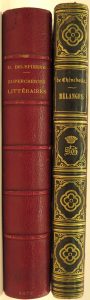 Londres, N. Trübner et Cie, 1872 in-8, demi-chagrin rouge à coins (min. frottements), dos à 5 nerfs (lég. frotté), t. dorée, couv. cons. (défr., 1 coin rest.), [8]-328 pp. Bon ex., int. frais.  Edit. originale devenue rare par l'archiviste, juriste et diplomate belge O. Delepierre (1802–1879); également bibliophile et "antiquaire", il passa une partie de sa vie à Londres. Il est l'auteur d'ouvr. sur la littérature macaronique, les rébus, les centons, l'histoire littéraire des fous, etc. Cachet sur les gardes. Ref. Vicaire III-114. Joint : Chênedollé, Charles Auguste Lioult de - Mélanges littéraires et bibliographiques, extraits des tomes VII, VIII et IX du Bulletin du bibliophile belge. Suivis de cinq annexes. Bruxelles, Devroye, 1853, in-8 (lég. bruniss.), demi-veau glacé aubergine de l'époque (min. frottements), dos à 4 nerfs perlés et caissons fleuronnés dorés, chiffre couronné doré au centre, tr. jaspées. Ouvr. très rare, tiré à 50 ex. seulement. Deux des 5 annexes annoncées manquent. Ex-libris et chiffre couronné doré du baron Jules de Saint-Genois. Cachet sur le contreplat sup. (2 vol.)