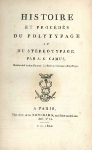 Paris, (Baudouin for) Ant. Aug. Renouard, 1802 8vo, cont. boards, [4]-335 (=135) pp. (some browning and foxing). Good copy. Very interesting early treatise on stereotyping and polytyping, with a few inserted examples (some folding). A.G. Camus (1740-1804) was a deputy at the National Convention and voted against Napoleon. Name at beginning Charles Lagasse, Bruxelles 1853.