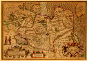 from John Speede's "A Prospect of the Most Famous Parts of the World", published by G. Humble, 39 x 50,5 cm, nicely col. (2 sm. wormholes rep. in armorial pl. which is left blank). Under passe-partout, glass and decorated wooden frame. Very good copy. Attractive map of Tartary with part of Europe, America and China. Decorative panels on 3 sides: on upper side views of the cities Astrakan, Samarkand, Cambalu, and Barents' wintering hut on Nova Zembla. On both sides panels of costumed figures. Insular Korea in the Pacific. We join : Tartaria. Amst., Hondius, c. 1620, 33 x 49 cm, full col. (some browning, soiling, c'fold split). Framed (not unframed). Good copy. With part of Europe, America and China. (2 maps)