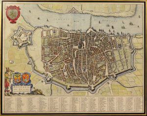 42 x 53 cm, cont. full-col. Framed (not unframed). Nice bird's-eye view with coats-of-arms of the city and key to the main locations. We join : Tertia Pars Brabantiae qua continetur Marchionat. S.R.I. (...) Antverpia (...). Amst., Blaeu, c. 1645, 42 x 52 cm, cont. bordercol. (some browning & spotting). Detailed map of Western Brabant, showing the region between Heusden, Breda, Bergen-op-Zoom, Antwerp and Leuven. Verso French text. Framed (not unframed). (2 maps)