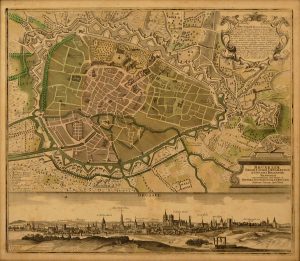 49,5 x 57,5 cm, partly orig. col. (some clear spotting). Under glass and gilt wooden frame (not unframed). Good copy.  City map with explanatory cartouche and key to the most important monuments. Nice panoramic view below in b/w.