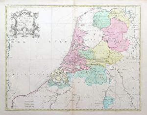 37 x 51 cm, orig col. (splitt. c'fold). Framed. With nice cart. and coats-of-arms. - 2e carte des Sept Provinces-Unies des Païs-Bas, &c. Gilson, 1755, old full col. (sl. splitt. c'fold). -  Carte du Théâtre de la guerre comprenant les Pays-Bas (...). Paris, Desnos, 1784, 57,3 x 90,7 cm, printed on 2 joined sheets, border col. (sl. soiled, folds, unobtrusive hole on folds junction). We join :  Vervolg op de Nieuwe Stedenwijzer der 17 Nederlandsche Provintien. Deventer, Jan de Lat, 1738, 2 separate sheets, orig. col., 2 engr. giving the distances between cities in the Low Countries. (5 pcs)