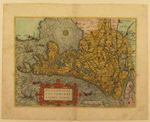 44,5 x 55,5 cm, b/w, mounted under passe-partout and nicely framed. Nice map that was also used in the Atlas Maior of F. de Wit, published by I. Covens & C. Mortier, c.1735. Ref. Koeman C&M 1 en 2. - Brabantia Ducatus. Amst., W. Blaeu, 1643-50, French ed., 38,5 x 50,3 cm, orig. col. (marg. soiling and foxing). Ref. Van der Krogt 3100: 2. - Hollandiae Cattorum regionis typus. Guicciardini, c. 1585, 24 x 32 cm, full col. (some staining, marg. soiling, printers' crease). Ref. Guicc. Ill. Holland-3-2. Good copies. - Lingea. Amst. Bor, 1621, engr. by B. Dolendo, 22,5 x 33 cm, b/w (marg. soiling & dampstaining). We join : Blaeu, J. - Toonneel des Aerdrycx, oft Nieuwe Atlas, Amst., 1649, copper engr., bright orig. goldheightened col., 41 x 25 cm (sl. soiled margins, sm. marg. def. rep., a few tiny rusty marg. spots, sm. paper dam. with loss of the "I" of "Iohan"). Beautiful t.-p. of the the 2nd pt. of the Blaeu Atlas. Corinthian portico surmounted by the royal coat-of-arms of Spain with the Golden Fleece. On both sides in niches : the allegorical personifications of the known continents. Moto on top. (5 maps)