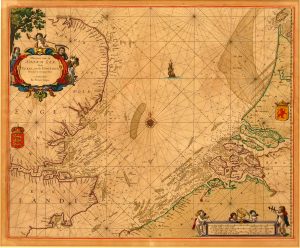 from "De Zee-Atlas, Ofte water-weereld, waer in vertoont werden alle de zee-kusten van het bekende des aerd-bodems", 45,5 x 56 cm, nicely old coloured & goldheightened map (sl. browned edges). Under passe-partout, glass in decorated gilt wooden frame (not unframed). Very nice sea chart of the North Sea with the coasts Flanders, Holland and England. As a sea chart very little interior detail is given, but the coastlines and principal coastal features are identified. Pieter Goos was famous for his sea atlas and pilot guides. "Pieter Goos' marine atlases were held to be among the finest printed at the time (...)" (Shirley).