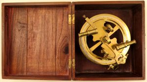 H 12 cm, diam. 27 cm, brass, signed "Elliott Bros London". Kept in original wooden box, 30 x 27 x 15 cm.  Round sextant, with brass scale, magnifier and coloured glass, double scope. The firm of Elliott Bros was founded in 1804 by William Elliott. In 1850 he formed a partnership with his sons, Frederick & Charles (Elliott & Sons) operating at 56 Strand, London. Whilst their father had specialized in drawing instruments, Elliott Bros offered a wide range of mathematical, optical and philosophical apparatus. The firm began using the signature "Elliott Bros London" in 1873 and "Elliott Bros (London) Ltd" in 1916, who appear to have discontinued producing surveying instruments around 1914-1918 and began to focus on developing electrical equipment.  We join : Brass surveyor's theodolite. English, vintage 19th c. A theodolite is a precision instrument for measuring angles in the horizontal and vertical planes. Incomplete instrument.