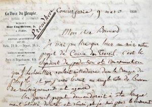 Bonnard et sa manière d’envisager une révolution des esprits [Bonnard, qui venait de fonder la Ligue du salut social, préconisait l’action violente et la révolution commerciale au profit d’un « commerce véridique » fondé sur un réseau de comptoirs coopératifs, dont les bénéfices, placés dans une « caisse de l’organisation du travail » seraient employés à l’éducation des enfants et aux secours pour les veuves]. « Je n’ai pu lire qu’hier au soir votre projet de Caisse de Travail. C’est le Syndicat de production et consommation que J. Lechevallier voulait introduire dans la Banque du peuple et que j’avais réduit au simple rôle de Bureau de renseignement et d’agence. Un pareil projet demanderait à être longuement étudié, discuté et mûri, et je suis pour le moment hors d’état de le faire […]. Votre préambule, présenté sous forme de considérants, me paraît en contradiction avec l’épilogue. Il est assez peu logique de déclarer la guerre aux parasites du commerce, pour finir par un appel aux marchands, boutiquiers et industriels. Il serait bien plus sûr, à mon avis, de ne point parler de la trop grande multiplication des établissements de commerce, et de laisser au temps à éclairer désormais sur ce point le public. Chacun se croira menacé par votre manifeste tandis qu’il faudrait, aujourd’hui surtout que nous prêchons la conciliation, rassurer tout le monde. Vous le pouvez sans faillir à vos principes, et avec bien plus d’avantages pour votre entreprise. En effet, tous les boutiquiers et marchands établis, peuvent et doivent même être considérés par vous comme les (?) responsables d’une immense société de commerce, ayant pour objet la vente des produits ou matières premières, et conséquemment la mission de les mettre à portée de tous les consommateurs. C’est l’agglomération de population, croyez-moi, qui multiplie les épiciers ; et c’est la stagnation des affaires et la misère des masses qui les ruine. Peut-être le nombre des magasins ne vous paraîtrait-il pas aussi excessif, si tout le monde gagnait de quoi vivre. Je ne vous citerai que ce seul exemple : si chacun en France pouvait s’acheter seulement une douzaine de chemises, cela ferait 36 millions de douzaines à fournir d’ici à deux ans : pensez-vous que le commerce des toiles, tel qu’il existe actuellement, ne peut pas être tout entier satisfait d’une pareille commande ? Raisonnez de même du vin, de la viande, de l’épicerie ; et au lieu de vous tant préoccuper du soin de réduire le nombre des marchands, vous vous attacherez davantage à leur procurer de la clientèle. La réduction viendra plus tard : il faut commencer par la circulation. De ce point de vue, qui ne touche pas du reste à vos projets ultérieurs de simplification, vous pouvez, ce me semble, remanier votre plan, et yintéresser tous ceux qu’aujourd’hui vous avez l’air de vouloir combattre. Vous leur feriez entendre qu’il s’agit pour eux d’acheter, avec un léger prélèvement sur leurs bénéfices, une clientèle, un débit toujours plus considérable ; de telle sorte, par exemple, que si les bénéfices du commerce français sont, comme vous le dites de 2 milliards, le commerce, en se cotisant pour une subvention annuelle de 100 millions (un 20e des bénéfices nets), s’assurerait chaque année un accroissement de rentes qui lui laisserait un bénéfice bien supérieur. Cette idée maîtresse bien comprise, votre société n’est plus qu’une société d’agence, bureau d’indication et renseignements, qui ne fait ombrage à personne, qui sert tout le monde, et dans les transactions qu’elle prépare ne fait que des satisfaits et jamais de mécontents. Les abus, qui dans ce moment vous choquent davantage, disparaîtraient ensuite d’eux-mêmes : vous auriez l’égale échange et le commerce véridique. En résumé, toute critique de l’ordre établi, si juste qu’elle soit, est bonne pour le journalisme, la tribune ou les livres, mais ne doit jamais se montrer dans un projet de société commerciale et industrielle. Ce qui seul doit paraître, en affaires, c’est le profit ; ce qui reste toujours sous-entendu, ce sont les réformes. Ainsi est fait le genre humain : ne vous gendarmez pas contre les susceptibilités et les délicatesses de sa routine. Si vous pensez pouvoir modifier vos idées d’après ces courtes remarques, je prendrai volontiers part et intérêt dans votre entreprise ; d’autant plus que je ne suis peut-être pas loin de remettre en branle la grosse cloche du crédit gratuit. Autrement, non : je veux bien être réformateur impitoyable dans mes livres, et quand cela est réclamé par les besoins de ma polémique ; je ne puis plus être que conciliant dans les choses de pratique et de réalisation […] ».