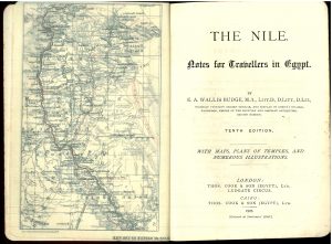 The Nile. Notes for travellers in Egypt. London, Cairo, Cook & Son, 1907 8vo, orig. limp brown cloth, gilt tooled hieroglyphs on covers, flat spine, marbled edges, xxi-[3]-955 pp. Good copy. Later ed. (orig. 1886) of this travel guide for the Nile region including 2 maps, plans of temples, numerous illustrations, a list of Egyptological words, etc. Very scientific information completely different from our modern tourist guides. We join : Meistermann, B. - Guide de Terre Sainte. Avec 26 cartes et 14 plans de villes gravés et en couleurs et 110 plans de monuments dans le texte. Paris, Picard, 1923, 8vo, orig. red publ. cloth. (2 vol.)