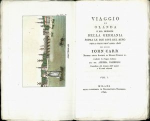 Travels - Netherlands /Germany - CARR, John - Viaggio in Olanda e nel mezzodì della Germania sopra le due rive del Reno nella state dell’anno 1806 (... ) Vol. I [-III] [trsl. from the English Andrea Zambelli].  Milan, G. Sonzogno, 1820