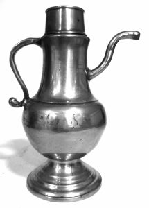 de type balustre sur large piédouche mouluré, panse pommiforme ornée de 2 fins filets, ressaut à l’épaulement, gorge se rétrécissant progressivement jusqu’au col qui porte un orifice au sommet d’un cylindre à pas de vis, sur lequel se visse un bouchon. Anse plate à bords arrondis fixée sur le col; retour inférieur. Long bec verseur à double courbure inversée, implanté au milieu de la gorge. H 15 cm. Poinçon de contrôle sur le bouchon: Nismes 1741 autour d’un C couronné.