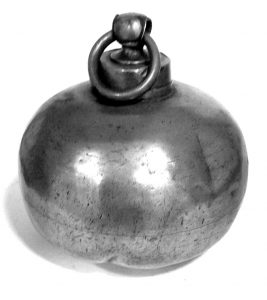 24,8 x 19,2 x 5,6 cm. Orifice circulaire au milieu de la face sup., fermé par un bouchon vissé avec anneau mobile en étain. Poinçon à la face inf. de Henry-Jean  Micheels (maître en 1806): rose couronnée avec initiales HM (D. 2853). - Large bouillotte de forme cylindrique, diam. 19 cm, H 12,5 cm, à bords sup. et inf. arrondis; orifice de remplissage au centre de la face sup., bouchon vissé avec anneau mobile. Poinçon à la face inf. de Henry-Jean  Micheels: rose couronnée avec initiales HM (D. 2853). - Bouillotte en forme de sphère aplatie, orifice de remplissage à son sommet, fermé par un bouchon vissé avec anneau mobile. Poinçon de Florent Kairis-Dumont (actif à Liège 1875-1888). (3 pcs)