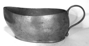 récipient oblong à parois bombées, bord sup. lég. arciforme, plus haut à l'avant qu’à l'arrière. Partie postérieure quasi arrondie, partie antérieure, en forme de coin émoussé. Avec anse plate contournée. H au milieu: 8 cm ; anse: 9,7 cm. Aucun poinçonnage sur cet objet usuel, assez commun en porcelaine, mais extrêmement rare en étain. Le bourdaloue, ainsi nommé d’après un célèbre prédicateur, était une sorte d’urinal féminin que les servantes glissaient, en cas de besoin, sous la robe des dames de qualité pendant les interminables prêches de Bourdaloue.