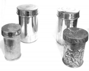La boîte est ornée de 2 jeunes femmes dont l’une  se regarde dans un miroir que lui présente un ange ailé, et d’un  ensemble de roses entre 2 grands arbres. H 11 cm; diam. 6 cm. Poinçon dans une petite dépression cruciforme de Nicolas Boicervoise (maître en 1759) ou Noël Boyleau (maître en 1743): CE en haut (Claire Etoffe), N B  et P en bas (gravure postérieure). - Pot à onguent cylindrique, à couvercle vissé décoré d’une gravure naïve représentant une maison dans un décor végétal. Sur le pot même, armoiries  gravées  maladroitement et illisibles. H 11,5 cm; diam. 5,6 cm. - Pot cylindrique fermé par un large bouchon vissé; à l’intérieur, un couvercle de même diam., pourvu d’une petite anse mobile. H 14 cm; diam. 8 cm. - Idem  (2nd ex.) (4 pcs)