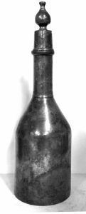 Cylindrique rétrécie vers un long col fin, cylindrique, orné d’une large bande; le col est marqué d’un épaississement qui porte une inscription indéchiffrable. Long couvercle conique vissé, surmonté d’un renflement en olive puis d’un bouton. H 32 cm, diam. à la base 9, 8 cm. Pas de poinçons. Patine grise.