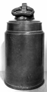 H 23 cm, diam. 12 cm. Pas de poinçonnage. Réserve de thériaque (?). Belle patine grise uniforme.