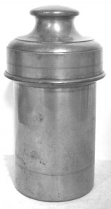 Bouteilles et pots de pharmacie - Pot cylindrique fermé par un grand bouchon vissé mamelonné avec grosse prise en bouton. Inscription "E Fin" sur le bouchon.