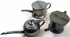 Panse pommiforme, large col rond, couvercle mamelonné avec prise en bouton, anse arrondie avec petit appui-pouce, long bec verseur tubulaire légèrement incurvé. -  Canard de malade tronconique sur large pied évasé. XIXe s. Avec couvercle dont une partie est mobile, articulée autour d’une charnière centrale. Anse arrondie avec retour inf. Bec verseur tubulaire incurvé. - Canard de malade tronconique sur piédouche en quart de rond. XIXe s. Avec couvercle dont une partie est mobile, articulée autour d’une charnière centrale. Anse arrondie avec retour inf. Bec verseur tubulaire rectiligne. (3 pcs)