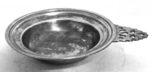 à aile relevée et moulurée, une oreille polylobée et ajourée d’un coeur et d’étoiles. Diam. 12 cm. Contenance : 3 onces. Poinçon de Pierre Servais Cagny, à Paris (maître en 1784) à la face inf. de l’oreille : PSCP (Boucaud Schonn 147).