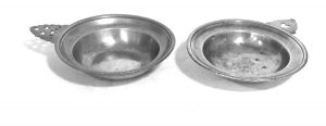 à aile relevée et moulurée, une oreille polylobée et ajourée d’un coeur et d’étoiles. Diam. 12 cm. Contenance : 3 onces. Poinçon au fond ext. de François Brouillet : F/ 1798   (Boucaud et Schon466). - Palette à saigner en étain, Paris (?), à aile relevée et moulurée, une courte oreille polylobée, ajourée d’un cœur. Au fond ext., initiale H, sans doute marque de propriété. (2 pcs)