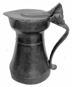 à partie basse cylindrique sur 1,5 cm. Décoré d’un très fin cordon à la partie haute du corps; gorge élargie portant 2 fins cordons, gobelet en quart de rond décoré de 2 filets, col avec bec verseur; toit plat recouvrant le bec; poucier en languette simple prolongée sur le toit. Anse en console à petit retour inf.  Poinçonnage au fond ext. de l’Hôtel-Dieu de Lyon apposé 2 fois, dont un bien lisible : Vierge de pitié soutenant un mourant, au-dessus de 3 fleurs de lis, à droite, lion debout, en-dessous de 3 fleurs de lys. Patine grise uniforme. H 14,3 cm au toit, 17 cm au poucier.