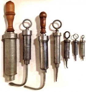 Corps cylindrique de 11,5 et 12 cm ; sur l’une, piston en étain terminé par un anneau, sur l’autre, piston en bois et manche en bois tourné ; canule vissée qui se recourbe à angle droit en son milieu et se termine par un renflement percé de plusieurs petits orifices. - Grande seringue à piston en bois dont l’extrémité du manche se dévisse pour donner place à une canule; extrémité fermée par un bouchon vissé en étain. Poinçon de Nicolas Dechamps (maître à Liège, XIXe siècle). L tot.: 34 cm. - Seringue à corps, piston et canule en étain, anneau de préhension au bout du piston. Poinçon de Florent Houtain-Dumont, (Liège, fin XIXe s.). L tot.: 27 cm. - Petite seringue de même type que la précédente. L tot.: 15 cm. - 2 petites seringues à usage auriculaire, à bout fixe, avec anneau de préhension en étain. L tot.: 10 et 11 cm. (7 pcs)
