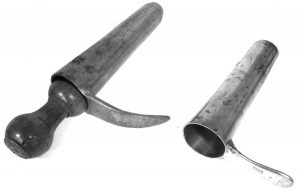avec poignée incurvée portant l’inscription Toulouse ainsi que la lettre N dans un petit cartouche hexagonal incus ; mandrin en bois avec préhension en boule et pointe arrondie. L : 14,7 cm. - Speculum en étain, XIXe s., avec poignée plate rectiligne portant l’inscription Faure/A Paris, ainsi qu’une étoile et le chiffre 2. L :  16,5 cm.